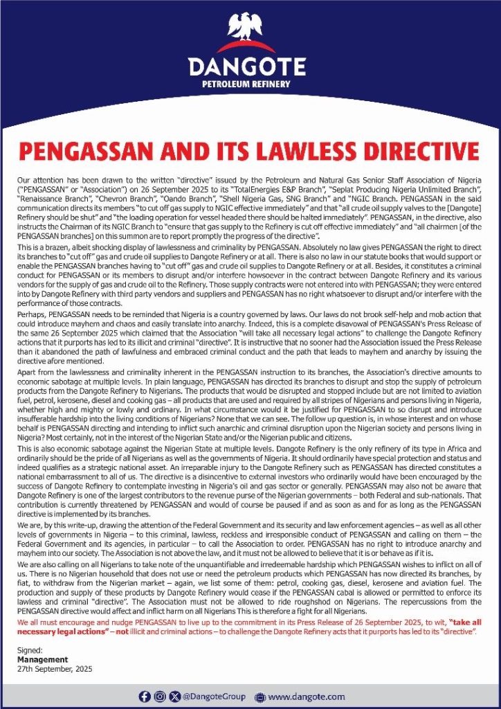 The management of Dangote Petroleum Refinery has condemned the Petroleum and Natural Gas Senior Staff Association of Nigeria (PENGASSAN) for issuing a directive to its branches to cut off gas supply to the refinery, calling it ‘lawless’ and ‘criminal.’