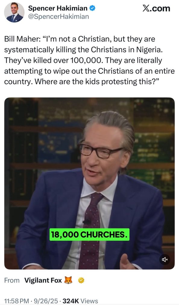 A recent tweet by the late American Conservative Activist and Founder of Turning Point USA, Charlie Kirk, (@charliekirk11) has sparked controversy and concern over the persecution of Christians in Nigeria. Another from Spencer Hakimian with a a quote from Bill Maher states “I’m not a Christian, but they are systematically killing the Christians in Nigeria. They’ve killed over 100,000.